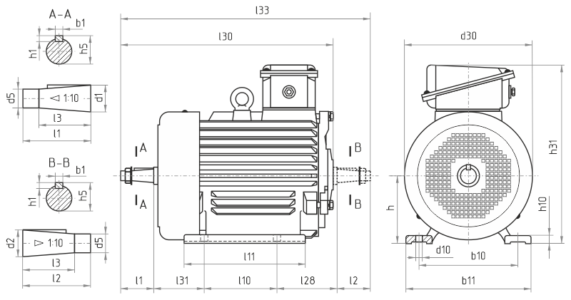 * Электродвигатели, размер l31 которых обозначен *, в исполнениях IM1003 и IM2003 имеют рабочий конец вала со стороны вентилятора; остальные - со стороны противоположной вентилятору (см. рис.)